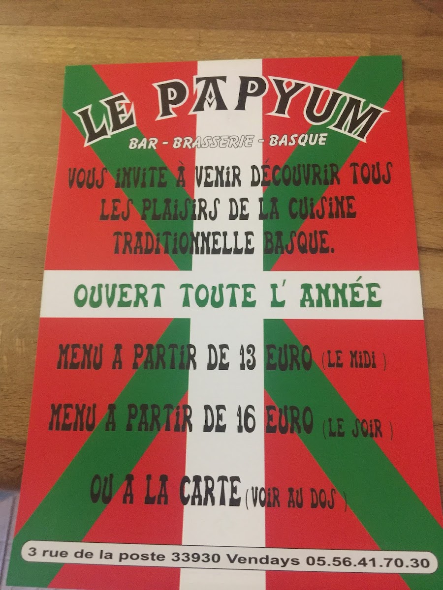 The menu at Papyum in Vendays-Montalivet leaves a clear impression of a kitchen that values simplicity, comfort, and well-balanced flavors. The selection feels curated rather than overwhelming, with each dish contributing to a cohesive dining experience. Starters like Charcuteries set the tone, offering a generous and satisfying introduction that highlights savory, well-seasoned cuts ideal for sharing. For mains, dishes such as Poulet S Tiger Douce and Rougail Saucisses showcase a confident use of spices and sauces, blending warmth and depth without overpowering the core ingredients. Meat lovers will appreciate Bavette D'ete Loyau, which stands out for its straightforward execution and focus on quality, while Omelette Mit Steinpilzen brings a comforting, earthy option that feels both rustic and refined. The dessert offerings provide a gentle, satisfying finish, with Gâteau Coco delivering a soft, fragrant sweetness and Gaâteau Pomme offering a familiar, homestyle balance of fruit and pastry. To complement the food, Bière Basque fits naturally into the menu, reinforcing the relaxed and authentic character of the restaurant. Overall, the menu feels thoughtful and consistent, where each dish plays a clear role in creating a complete and enjoyable dining experience centered on honest flavors and approachable choices.